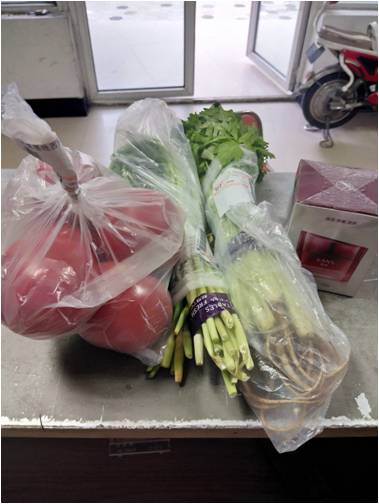 5月16日下午一點半左右,驕陽似火,萬楊物業(yè)萊茵苑小區(qū)的保潔人員在正常打掃著道路,在掃至34幢時,發(fā)現(xiàn)地面上散落著做飯的食材,有西紅柿、芹菜、蒜苗、還有一盒化妝品,包裝袋都還完整,應(yīng)該不是業(yè)主扔的廢棄物,那肯定就是不小心丟失的,保潔員小朱就將食材全部送至客服辦公室,客服人員立即通知監(jiān)控室調(diào)閱監(jiān)控,因為不知道具體時間,但是想著人流量少的應(yīng)該在中午時分,所以從中午開始調(diào)閱。功夫不負有心人,終于查到是一位老大爺開著小三輪車將食材滑落了。