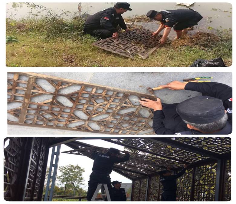 次日,木匠出身的保安隊員黃仁貴承擔了修善的任務,黃仁貴從便民商店買來了木膠和小鐵釘,十分小心的把斷落散架的頂板一節(jié)節(jié)有序的粘釘復位,這塊長2米、寬0.6米的精制頂板前后修復4個多小時。修理完成后的安裝環(huán)節(jié),項目經(jīng)理還特別安排值日班長嚴長國、車巡隊員方德元會同“小木匠”黃仁貴,攜帶整合后的廊亭頂板和升降云梯到達MsD廊亭現(xiàn)場進行安裝。