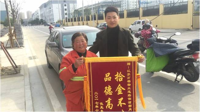 2017年11月20日的揚(yáng)州城氣溫只有2℃,瑟瑟寒風(fēng)中,仇先生滿懷感激之情送來了一面錦旗。江蘇萬楊物業(yè)道路保潔員肖金蘭看著錦旗上“拾金不昧、品德高尚”八個(gè)大字,滿面春風(fēng)。