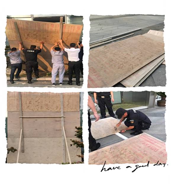 江蘇萬楊物業(yè)廣陵行政服務中心的項目經(jīng)理王在香在接收到現(xiàn)場巡視保安組的匯報后,帶領保潔員第一時間來到現(xiàn)場進行安全檢查,在無人員受傷的情況下,王經(jīng)理立刻安排保潔清理現(xiàn)場玻璃碎片并及時放上禁止三角牌!由于整面墻體玻璃長1.4米、寬3.5米,玻璃面較大,時間緊迫,正處于下班時間,為了防止有人誤入,王經(jīng)理決定安排兩位工程人員駕車取來三塊木工板,進行拼接,再用兩塊木頭方裝訂,做成一塊長接近2米寬3.6米的超大塊木板將墻體遮擋住。