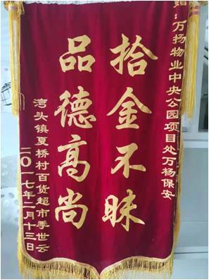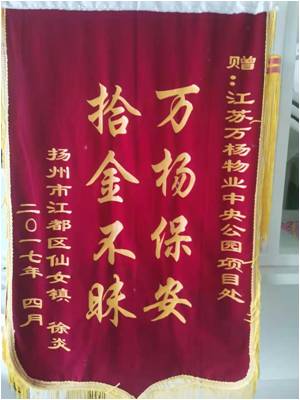 2018年至2020年江蘇萬(wàn)楊物業(yè)中央公園項(xiàng)目處共收獲拾金不昧48起,其中榮獲錦旗2面。
