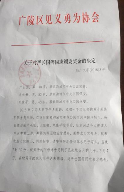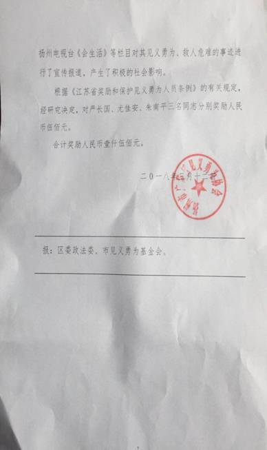 3月26日下午2點(diǎn),廣陵區(qū)公安分局灣頭派出所傳來信息,經(jīng)廣陵區(qū)公安分局政治部嚴(yán)格審核申報(bào),廣陵區(qū)見義勇為協(xié)會(huì)下發(fā)--揚(yáng)廣義字(2018)8號(hào)《關(guān)于對(duì)嚴(yán)長國等同志頒發(fā)獎(jiǎng)金的決定》。
