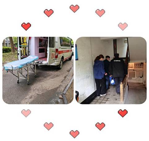 原來是343樓的一戶業(yè)主,當(dāng)天剛好出院回家。救護(hù)車上只有一位陪同人員,隨著擔(dān)架車從上面推下來,因?yàn)榧覍偈敲,她有點(diǎn)犯愁,需要抬上樓人手不夠,正好這時(shí),西門崗的秩序維護(hù)員劉德山也趕過來了解情況,李虹又用對講機(jī)呼叫班長過來,主動提出幫忙將病人護(hù)送到家。