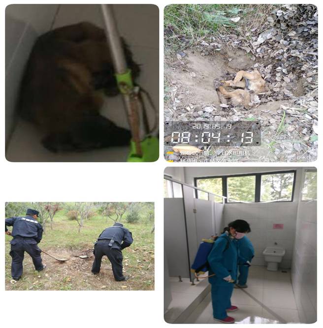 事關環(huán)境衛(wèi)生,事關隱患安全,項目韋長英經(jīng)理接報后,立即進行了行動布置:1、安全考慮,暫時關閉高家河固定廁所的對外開放;2、要求車巡崗隊員尤佳安、金海山攜帶工具迅速到達現(xiàn)場,在做好自身防護的同時清除深埋流浪狗;3、要求保潔班長曹如卓立即抽調人員,攜帶防護口罩、消毒藥品和器材,對高家河固定廁所進行全面徹底的清洗消毒處理。