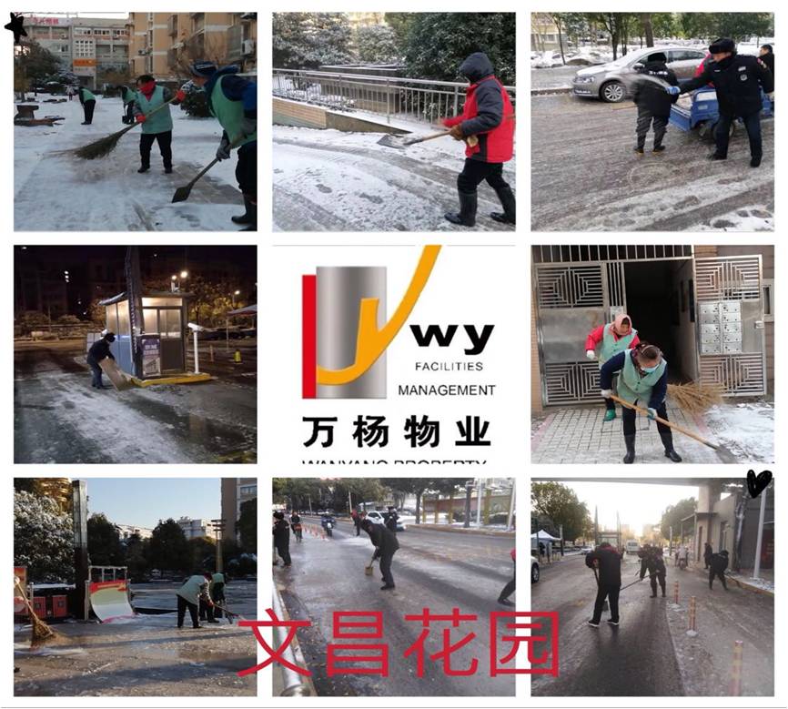 看到寒潮黃色預(yù)警后,項(xiàng)目經(jīng)理張彪根據(jù)小區(qū)實(shí)際情況,提前制定了鏟雪除冰應(yīng)急預(yù)案,并召開除雪會(huì)議,部署了工作,規(guī)劃好人員。當(dāng)大雪如約而至后,根據(jù)會(huì)議中的安排,數(shù)十名門崗人員首先將5個(gè)門崗周圍的積雪清除掉,部分人員向主干道的路面和2個(gè)人防的進(jìn)出口撒鹽,同時(shí)保潔部的23個(gè)員工負(fù)責(zé)各自工作區(qū)域支干道及單元樓門口的積雪鏟除。3名前臺(tái)和4名工程人員負(fù)責(zé)清理中心廣場四周延伸至主干道。朦朧的燈光下隨處可見物業(yè)人員忙碌的身影。所有員工有條不紊的清掃著,用實(shí)際行動(dòng)給居民帶去“溫暖”,讓居民們更加深刻感受到萬楊公司的“精心管理、全心服務(wù)”的服務(wù)理念。