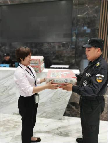 傍晚5點(diǎn)左右,冷經(jīng)理會(huì)同保安負(fù)責(zé)人朱有順帶著甲方慰問品:方便面、火腿腸,花露水、風(fēng)油精”等物品,來到了沈飛一樓接待大廳,親切看望值守的晚班同事們;在分發(fā)慰問品的同時(shí),冷經(jīng)理傳達(dá)了甲方領(lǐng)導(dǎo)的關(guān)懷和心意。