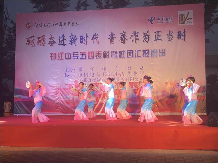6月12日晚18點(diǎn),邗江中專校園廣場(chǎng)變的熱鬧起來,由邗江中專主辦、江蘇萬楊物業(yè)管理服務(wù)有限公司協(xié)辦的校園社團(tuán)匯報(bào)演出拉開了序幕。這臺(tái)晚會(huì)的主題是“砥礪奮進(jìn)新時(shí)代,青春作為正當(dāng)時(shí)”,社團(tuán)各個(gè)小組的同學(xué)們表演了形式多樣,生動(dòng)活潑,健康向上的文體活動(dòng)。整臺(tái)晚會(huì)氣氛熱烈,掌聲不斷。