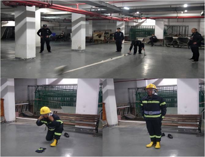 下午兩點,首次演示任務(wù)在公司秩序維護(hù)部劉經(jīng)理的“開始”口令聲中拉開了序幕。首先是消防服、安全防護(hù)帽穿戴的展示,要求隊員用最短的時間準(zhǔn)確無誤穿戴整齊。緊接著是二名隊員配合拋水帶并復(fù)原水帶的展示,只聽見教練員口令一發(fā)出,卷著的消防水帶“呲”的一聲筆直得甩向前方,隨后一名隊員迅速跟上,和前方的隊員配合快而不亂地卷起水帶并立正站好。整個過程時間控制在了一分鐘內(nèi)。頃刻,周圍響起了熱烈的掌聲,兩名隊員露出了開心的笑容。