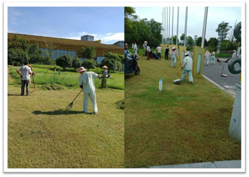 直至傍晚,大家還在汗流浹背地忙碌著,經(jīng)過(guò)清理后的大片草坪又恢復(fù)了往日的整潔、平坦,猶如一大塊綠色的地毯,園區(qū)的環(huán)境面貌煥然一新。