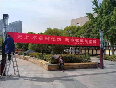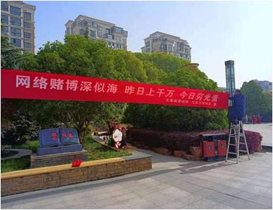 下午,江蘇萬楊物業(yè)文昌花園項(xiàng)目又訂制了兩條具有特點(diǎn)的橫幅,“天上不會(huì)掉餡餅,跨境賭博是陷餅”、“網(wǎng)絡(luò)賭博深似海,昨日上千萬,今日窮光蛋”,醒目地懸掛于中心廣場,讓休閑和來來往往地居民一眼就能夠看到,牢記世上沒有免費(fèi)的午餐。