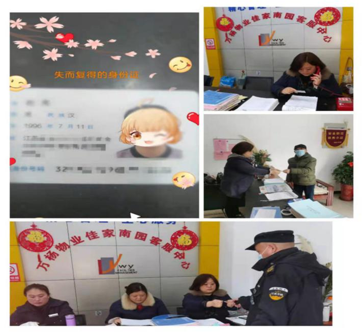“要不是你們物業(yè)打電話,我兒子到現(xiàn)在都還沒發(fā)現(xiàn)身份證掉了。現(xiàn)在疫情特殊時期,去補辦也是很麻煩的,真是太感謝了!标惥晷χ鴮I(yè)主說:“精心管理,全心服務是我們物業(yè)的服務宗旨,為業(yè)主提供最貼心、最放心的物業(yè)服務,用真心換取業(yè)主滿意是我們的工作!”(江蘇萬楊物業(yè)佳家南園 湯建)