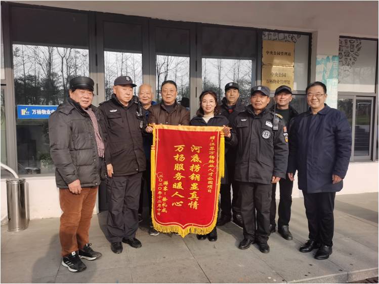 12月12日下午2點(diǎn),江蘇萬(wàn)物物業(yè)中央公園物業(yè)辦公室門(mén)前,來(lái)了5位特殊的客人,說(shuō)是來(lái)園送錦旗致謝的,項(xiàng)目經(jīng)理韋長(zhǎng)英、保安隊(duì)長(zhǎng)周懷月連忙起身迎接……