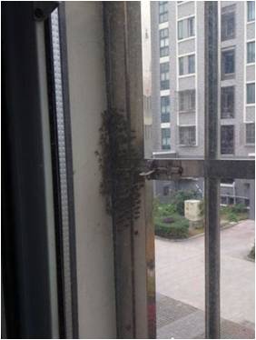 聽完該業(yè)主的講述,物業(yè)人員迅速行動,經(jīng)理助理及秩序維護員攜帶殺蟲劑及手套等工具隨業(yè)主趕往現(xiàn)場。到達現(xiàn)場,我們看到業(yè)主家窗戶外不銹鋼防盜窗插銷處有一小群胡蜂集聚,時不時有一兩只會飛出蜂群,要是蜂群繼續(xù)擴大,導致蟄到人,蟄傷業(yè)主,后果不堪設(shè)想。