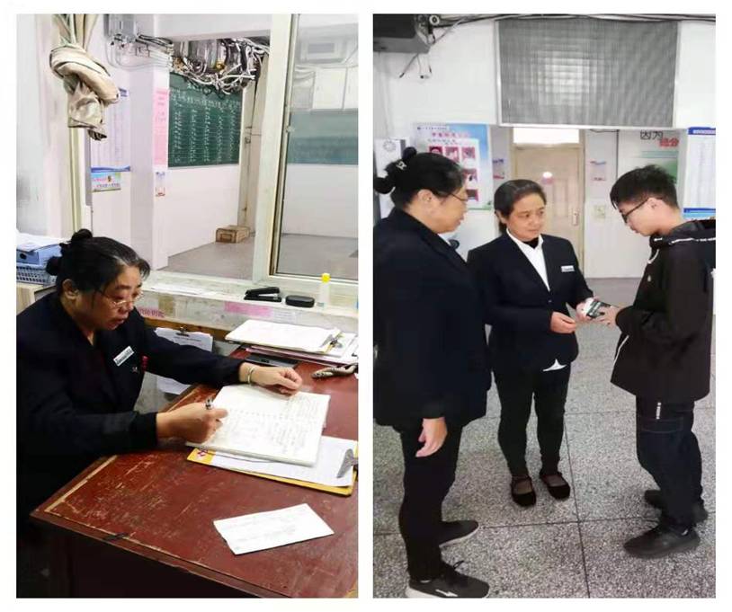 當尤亞男巡視返回值班室時,發(fā)現(xiàn)412寢室的蘆思磊正在焦急的等她:“阿姨,我的手機丟了,可以幫我調監(jiān)控查找一下嗎?”宿管老師尤亞男微笑的詢問他是在哪里丟失的,手機是什么品牌,顏色是什么等等情況,確認無誤后,打開柜子將手機交還給該生并做好登記。學生連聲感謝。