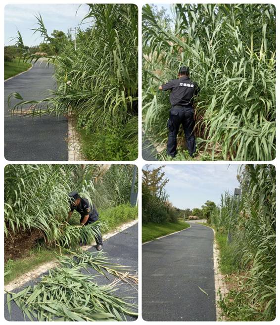 公園物業(yè)管理處,第一時(shí)間聯(lián)系了該區(qū)域的施工單位,請他們清除倒伏蘆葦,但是施工單位因人手不夠不能及時(shí)來園區(qū)又請求物業(yè)幫忙處理。