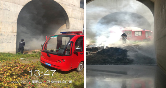 3月17日下午1點,揚州市廣陵大橋西頭橋洞下,煙霧濃濃,煙霧中不時冒出耀眼的火花,少許火苗已接近了橋面的高度。江蘇萬楊物業(yè)廖家溝城市中央公園巡邏崗隊員金海山、朱有順例行巡邏至此發(fā)現(xiàn)火情,第一時間通過無線對講平臺呼叫廣陵新城應(yīng)急消防小組值日組長周懷斌,簡要說明廣陵橋下火情情況;周組長接報后與消防應(yīng)急小組隊員黃仁貴駕駛微型消防車以最快的速度趕到了現(xiàn)場,與現(xiàn)場隊員一起攜手解除橋下火情……