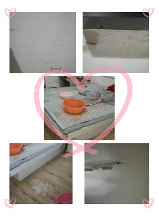 到了10樓,發(fā)現(xiàn)業(yè)主家的客廳墻面自上而下已全部脫皮,而且最下方一條水柱還在噴射著,主臥室頂?shù)挠推嵋呀?jīng)脫落,床上、地上放著多個盆在接水,女業(yè)主著急的說,他們只是下午出去有事的,沒想到回到家變成了這個慘狀。