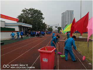 運(yùn)動(dòng)場(chǎng)上彩旗飛舞、氣氛熱烈,4000多師生員工喜笑顏開,盡情地享受歡樂。大會(huì)在雄偉的《國(guó)歌》聲中拉開序幕,五星紅旗冉冉升起,迎風(fēng)飄揚(yáng)。董院長(zhǎng)熱情洋溢的開幕式講話結(jié)束后,賽場(chǎng)上的比賽井井有條。公司孫總親自掛帥現(xiàn)場(chǎng)動(dòng)員指導(dǎo),佘、吳兩位經(jīng)理精心組織安排,大家開心的接受了工作任務(wù),有人暫時(shí)忘記了剛下夜班的疲憊,還有人不計(jì)較路途遙遠(yuǎn),從兄弟項(xiàng)目趕來(lái)支援,一絲不茍展開工作,大家耳聽八面、眼觀四方、勤懇熱情,不停的巡查,份內(nèi)事主動(dòng)做,份外事爭(zhēng)著做,上午的比賽剛一結(jié)束,所有的保潔員顧不上吃午飯,主動(dòng)集中到操場(chǎng)上進(jìn)行清掃,大家齊心協(xié)力打掃完操場(chǎng),稍稍休息調(diào)整后再次進(jìn)入到各個(gè)區(qū)域打掃。使得運(yùn)動(dòng)場(chǎng)上安全得到了保障、秩序井然、氣氛和諧,場(chǎng)地所有區(qū)域整潔干凈。